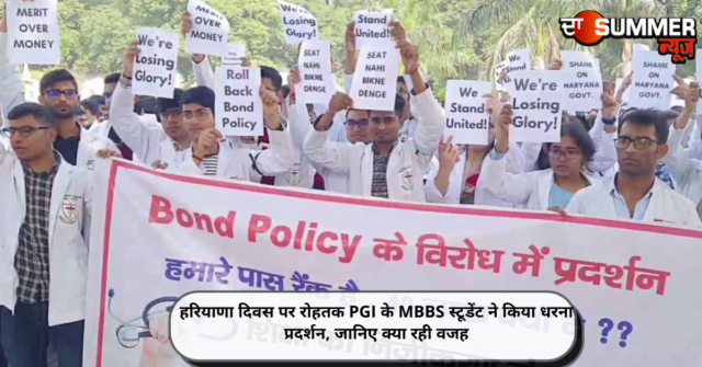 रोहतक (अकुर कपूर): जहां हरियाणा अपना 56वां स्थापना दिवस मना है। वहीं दूसरी तरफ रोहतक के पीजीआई के एमबीबीएस स्टूडेंट की धरने प्रदर्शन की खबर सामने आ रही है। मंगलवार को हरियाणा दिवस पर रोहतक के एमबीबीएस के सैकड़ों की संख्या में स्टूडेंट्स ने हरियाणा सरकार की पढ़ाई के दौरान चालीस लाख की बांड पॉलिसी लागू के विरोध में धरना प्रदर्शन शुरू किया है।