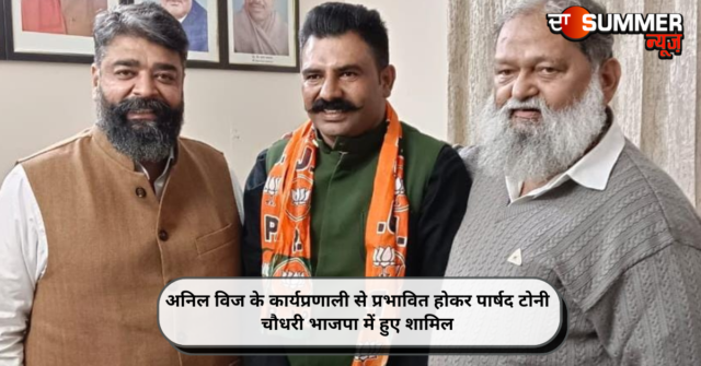 अम्बाला (अंकुर कपूर): हरियाणा के गृह व स्वास्थ्य मंत्री अनिल विज की कार्यप्रणाली से प्रभावित होकर अम्बाला शहर नगर निगम के वार्ड नम्बर 4 से एचडीएफ पार्षद विजय कुमार उर्फ टोनी चौधरी ने सोमवार को भारतीय जनता पार्टी में शामिल होने की घोषणा की। इस दौरान शहर विधायक असीम गोयल भी मौजूद थे। गृह मंत्री अनिल विज ने अपने आवास पर पार्षद टोनी चौधरी को भारतीय जनता पार्टी का पटका पहनाकर उनका पार्टी में स्वागत किया।