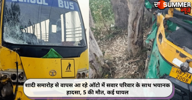 पलवल (एकता): पलवल में एक बड़ा सड़क हादसा होने का मामला सामने आया है। जहां गांव कमरावली में शादी समारोह में शामिल होकर ऑटो में सवार होकर घर वापस लौट रहे एक ही परिवार के 10 सदस्यों को एक तेज रफ्तार स्कूली बस ने सामने से टक्कर मार दी। टक्कर इतनी जोरदार थी कि टक्कर लगने से ऑटो अनियंत्रित होकर पेड़ में जा लगा। इस हादसे में ऑटो सवार एक ही परिवार की तीन युवती सहित 5 लोगों की मौके पर ही मौत हो गई। जबकि 6 लोग गंभीर रूप से घायल हो गए। घायल लोगों को अस्पताल में इलाज के लिए भर्ती करवाया गया है। चांदहट थाना पुलिस मामले की जांच में जुटी हुई है।