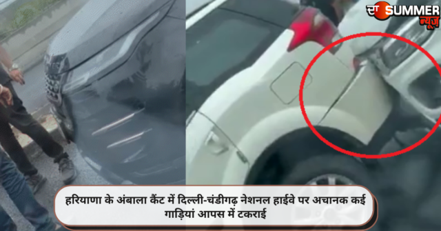 अंबाला (अंकुर कपूर): हरियाणा के अंबाला कैंट में दिल्ली-चंडीगढ़ नेशनल हाईवे पर अचानक गाड़ी के ब्रेक लगाने से 4-5 गाड़ियां आपस में भिड़ गईं। मीडिया सूत्रों के अनुसार रोड पर आगे जा रहे टेंपू से एक एंगल गिरा, जिसके बाद उसके पीछे चल रही गाड़ी ने जैसे ही ब्रेक लगाई उसके बाद एक के बाद एक कई गाड़ियां आपस में भिड़ी। जैसे ही इसकी सूचना पुलिस को मिली तो वह मौके पर पहुंची और कारवाई में जुट गई। आगे वाली गाड़ी के मालिक ने बताया कि वो दिल्ली की ओर से आ रहे थे तो अचानक आगे चल रहे ट्रैक से एक एंगल गिरा। हालांकि गनीमत यह रही कि कोई जानी नुकसान नहीं हुआ।