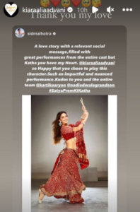 सिद्धार्थ ने इंस्टाग्राम पर पत्नी कियारा और उसकी फिल्म की खूब तारीफ की। उन्होंने कियारा की गरबा खेलने वाली फोटो पर कैप्शन लिखा, ‘खूबसूरत सोशल मैसेज के साथ एक प्यारी सी प्रेम कहानी, पूरी कास्ट के शानदार परफॉर्मेंस से लबालब, लेकिन कथा तुम मेरे दिल में हो।’ वहीं दूसरी तरफ कियारा ने भी पति सिद्धार्थ को जवाब दिया। उन्होंने कहा ‘थैंक्यू माय लव’।