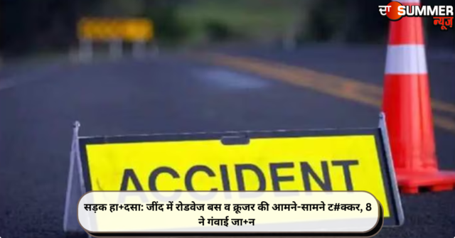 जींद (एकता): हरियाणा में जींद-भिवानी मार्ग पर एक बड़ा सड़क हा+दसा हुआ। जहां भिवानी रोडवेज की एक बस और क्रूजर जीप के बीच ट#क्कर होने से 8 लोगों की जा$न चली गई। जबकि 12 अन्य लोग गंभीर रूप से घायल हो गए।