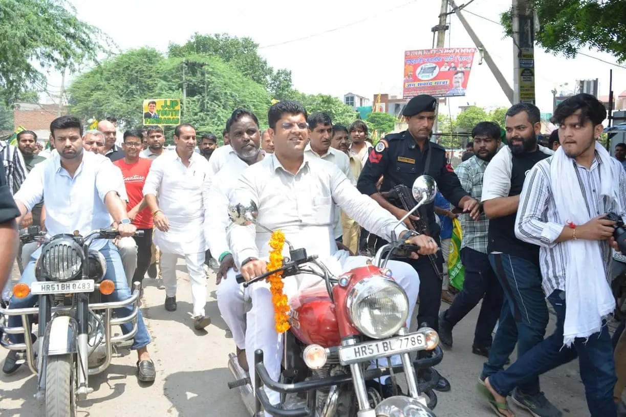 बता दें कि रविवार को गोंछी में जजपा नेता करामत अली ने जनसभा आयोजित की थी। इसमें पूर्व डिप्टी सीएम दुष्यंत चौटाला बतौर मुख्य अतिथि शामिल हुए थे। पार्टी कार्यकर्ताओं ने जनसभा से पहले एक बाइक रैली निकाली थी। ये रैली सोहना मोड़ टी प्वाइंट से शुरू होकर गोछी तक गई थी। इसमें पूर्व डिप्टी सीएम दुष्यंत चौटाला लाल रंग की बुलेट पर बिना हेलमेट पहने सवारी की। रैली में पार्टी के लोकसभा प्रत्याशी रहे नलिन हुड्डा समेत सैकड़ों कार्यकर्ता बिना हेलमेट के बाइक दौड़ाते नजर आए। मामला मीडिया में आने के बाद ट्रैफिक पुलिस हरकत में आयी और बिना हेलमेट बाइक चलाने वालों का चालान कर दिया।