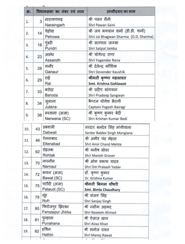 हरियाणा,10 सितम्बर –हरियाणा में BJP ने उम्मीदवारों की दूसरी लिस्ट की घोषणा कर दी है। इस लिस्ट में 21 उम्मीदवार घोषित किए गए हैं। जिनमें हथीन से मौजूदा विधायक प्रवीन डागर का टिकट काटकर मनोज रावत को प्रत्याशी बनाया है.वहीं होडल से विधायक जगदीश नायर के स्थान पर हरेंद्र रामरतन को प्रत्याशी बनाया है।