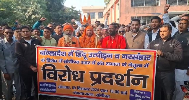 10 दिसम्बर, सोनीपत –बांग्लादेश में हिंदुओं पर अत्याचार, उन पर हो रहे ह.मले व मंदिरों में तोड़फोड़ के विरोध में भाजपा पदाधिकारियों व कार्यकर्ताओं ने सामाजिक संगठनों के साथ रोष मार्च निकाला। संतों के नेतृत्व में रोष मार्च कोर्ट रोड स्थित पंचायत भवन से शुरू किया गया, जो विभिन्न मार्गों से होते हुए गोहाना रोड स्थित लघु सचिवालय पहुंचा।