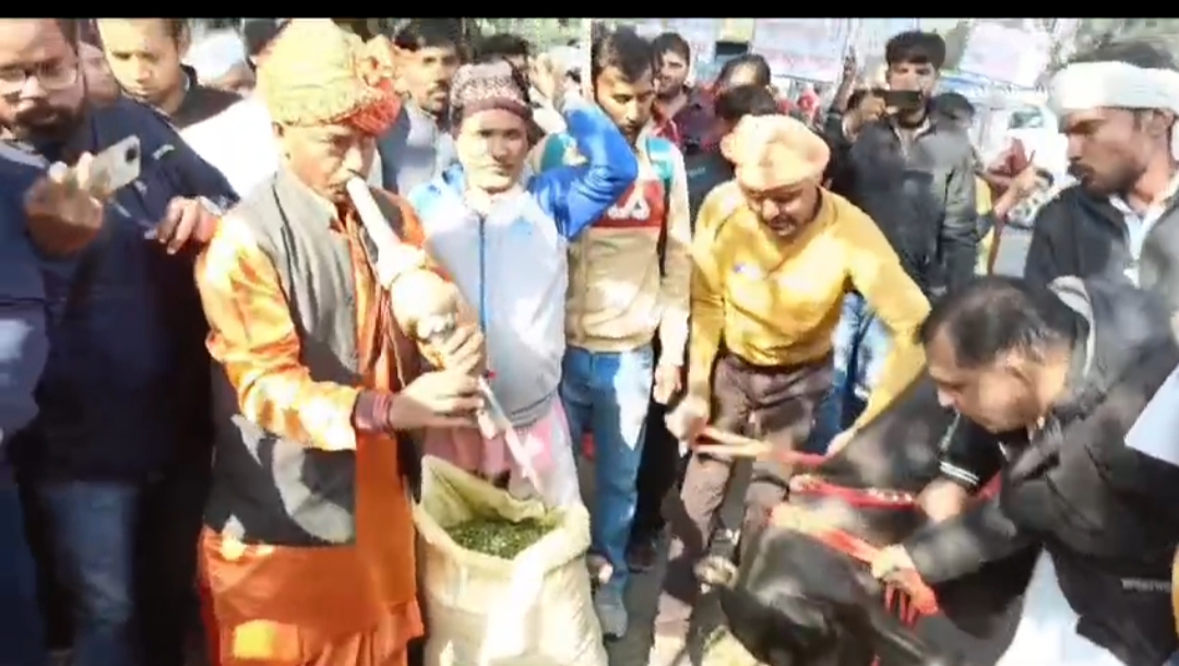 भैंस के आगे बीन बजाकर प्रदर्शन करते हुए लघु सचिवालय पहुंचे